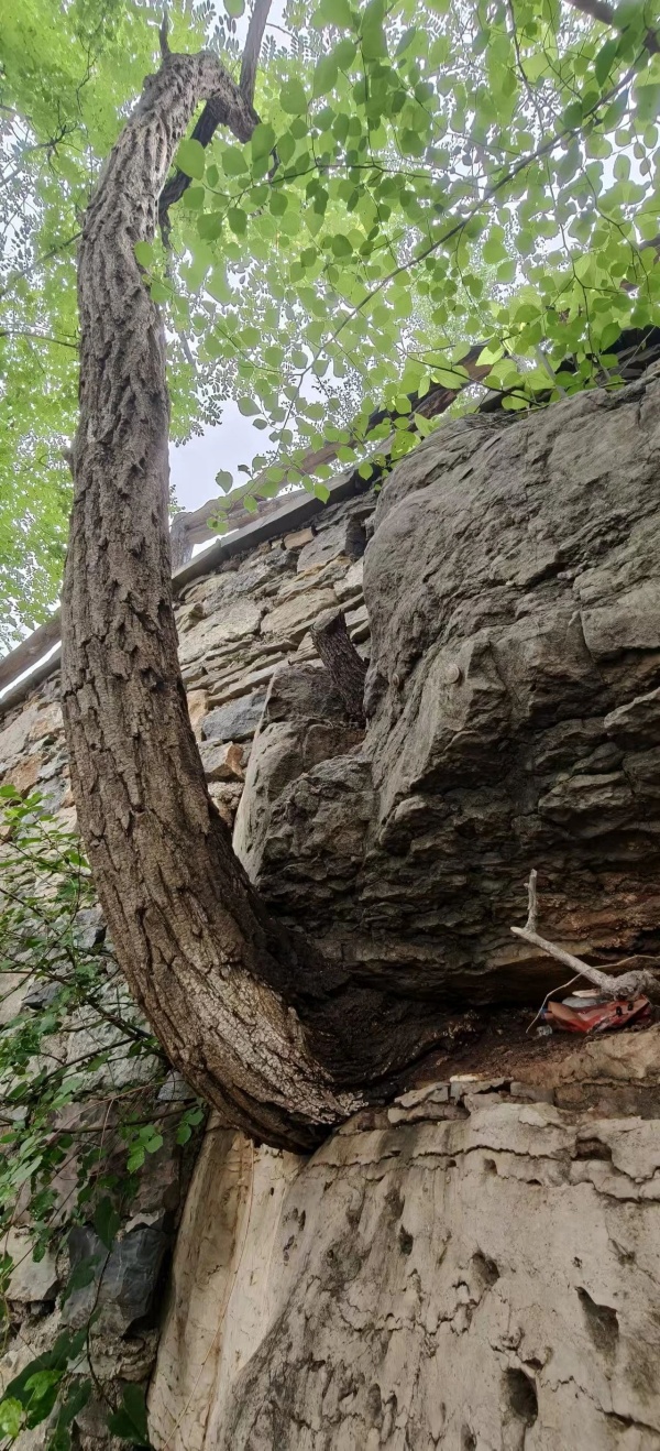 李锦老家前面在岩石中顽强生长的国槐,从石缝中钻出。 第三个则是李锦老师庭院门外扎根于岩石缝隙中的一棵国槐:两大巨石之间,一棵碗口般粗的国槐,树根从两块大岩石缝隙中弯出,打了个近九十度的折,向上挺身而出数米之高,枝繁叶茂屹立于悬崖峭壁之上。生命力之顽强令人惊叹不已。 听了李锦老师的话语,尤其是看完三个不同的树根,对李锦老师所有的好奇与疑惑便释然了。