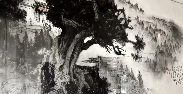 首先是悬挂在李锦老师门厅里,题为“根固风雄”的国画。由山东画院高级画师胡定南先生专门为李锦老师而作,千年古树盘根错节长在山石悬崖之间,老枝遒劲、新芽茂密,画中题词赞誉李锦老师扎根沂蒙三十余年,胸怀天下,雄才大略之风骨。