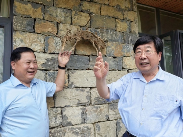 右为李锦老师介绍树根,左为平邑作协主席姜晓彬