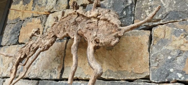 李锦家墙上挂着的“树魂”。这是在石缝中挖出的树根。