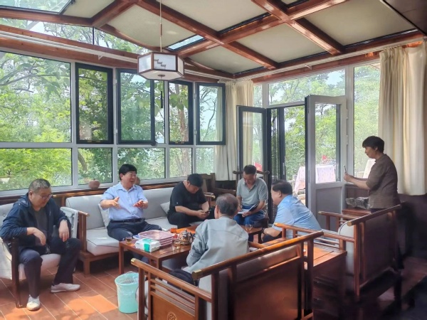 李锦在家中与平邑作协会员交流工作经验