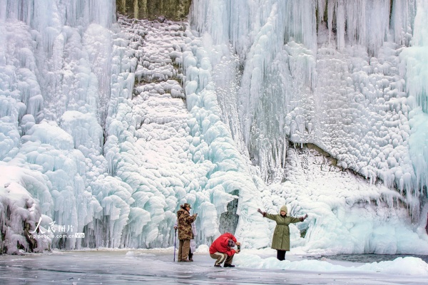 寒冬时节,河北省承德市兴隆县青松岭镇石门台村附近水库下游形成天然冰瀑,成为一道独特的冬日景观,吸引众多游客前来游玩。刘满仓摄(人民图片网)
