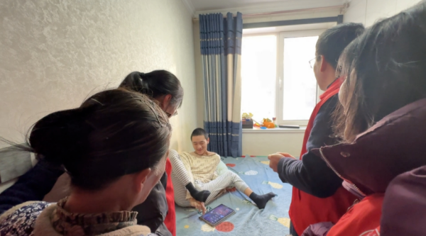 随后,志愿者来到常青小区王梓涵家中。2010年出生的梓涵因脑瘫生活无法自理,也是进入小课堂较早的学生之一。志愿者进门时梓涵正在用平板电脑玩游戏,他告诉大家自己已经学到小学四年级的课程了,所以虽然只有一只手灵活,但打这款游戏还是很厉害的。奶奶说:“得知今天圆梦爱心协会的叔叔阿姨要来家里,梓涵可高兴了,这么多年来,志愿者就像亲人一样无私地帮助我们,非常感谢大家。”