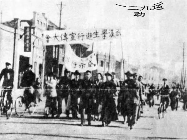 12月9日示威游行:在中共北平临时工委领导下,北平各大中学校学生6000余人冲破军警封锁,前往新华门向国民政府请愿,高呼“停止内战,一致抗日”“反对华北自治”“打倒日本帝国主义”等口号。请愿遭军警镇压,学生转为示威游行,多人受伤、被捕。