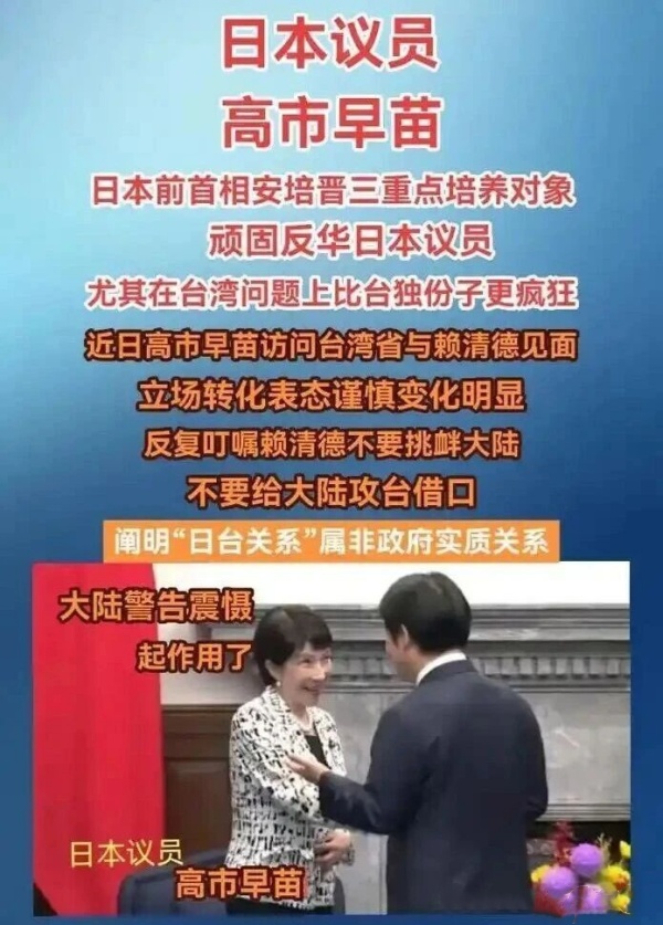日方继续遵守日本在中日联合声明中表明的关于台湾问题的立场,重申中国只有一个。日本将继续只同台湾维持民间和地区性往来。然而日本没有信守承诺,长时间政客串访台湾,高市早苗在当议员期间也串访过台湾。