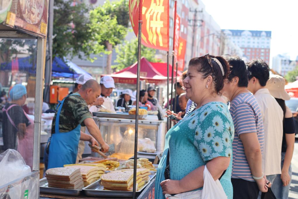 这是俄罗斯游客黑河早市选购早餐(7月8日摄)。新华社记者 姜思妮 摄 在距离黑河市区200多公里的五大连池,14座火山、300年前喷涌的熔岩化作“天然理疗舱”。可以在石海星空营地枕着银河入梦;在冷矿泉边畅饮;在火山脚下的康养小镇用矿泥敷面……康养“旅居”生活吸引着中外游客。 千年积雪万年松,直上人间第一峰。在长白山脚下,二道白河镇作为吉林省首个慢行城,迎来了一批“慢城课堂”的游客。
