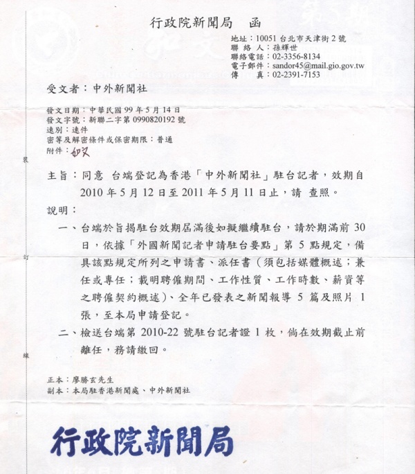 中外新闻社韦燕总裁向台湾分社副社长尹衍桓颁发“任命书”