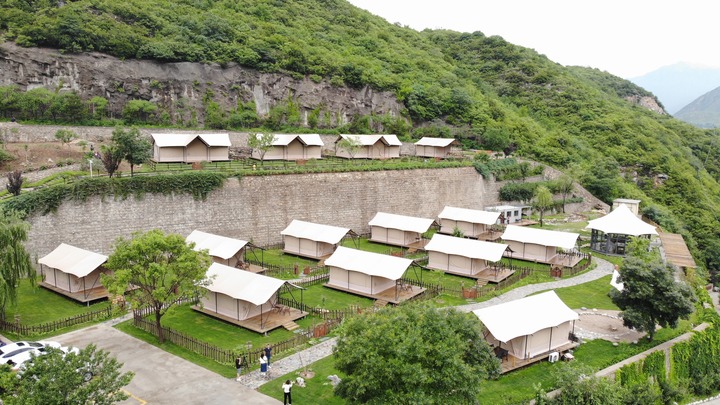 位于河北省保定市野三坡景区的可野露营基地(7月1日摄)。新华社记者 高博 摄 新华社石家庄7月22日电(记者高博)“周围有山有水,晚上不仅能看星星,还有篝火晚会。”说起去河北省保定市野三坡景区露营的经历,28岁的陈鹤认为,“最重要的是孩子能亲近自然,可以无拘无束地玩耍。” 撑一顶帐篷、搭一块天幕、备一桌餐品……近年来,“小聚集、大空间”的旅游新业态颇受消费者欢迎。露营逐渐升温,成为流行的休闲方式。 35岁的晋探宇是野三坡景区可野露营基地负责人,曾在北京从事旅游相关工作多年。2021年7月,晋探宇回到家乡,创办了这个露营基地。 “我们营地有13顶帐篷,生意还不错,节假日经常要提前一两周预订。”晋探宇说,疫情给长线旅游和传统旅游业态造成不小冲击,但人们对旅游的诉求并没有降低,体验感和娱乐性更强的露营就是不错的选择。