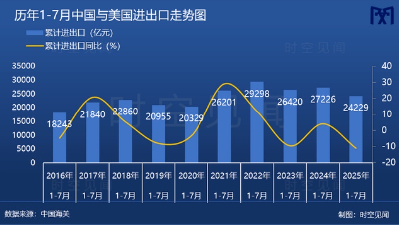2、中美、中欧的贸易下降情况值得重视 首先,从国际背景谈一谈,也就是国际循环的主要情况。 9月14日至15日,中美经贸团队在西班牙马德里举行会谈。因为中美经贸关系的本质是互利共赢。作为全球体量最大的两个经济体,经贸合作为两国企业和消费者带来了实实在在的利益。中美经济总量超过世界三分之一,双边贸易额约占世界五分之一。大家关注,自然是可以理解的。 今年以来,中美、中欧的贸易情况总体下滑明显,中美贸易 2025年1-7月 出口同比下降12% 中国进口同比下降12.6%。特别是2025年第二季度以来,美国实施的“对等关税”政策影响显著。8月份中国对美出口大幅下降33.1%,这主要是因为企业前期担心关税加码而“提前出口”的效应消退,以及高额关税如“悬顶之剑”带来的持续不确定性。 中欧贸易表现相对稳定,但内在结构发生变化。
