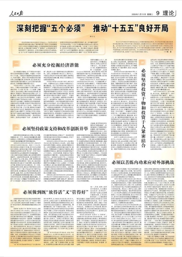 连日来,《人民日报》连推六篇“钟才平”署名文章,引起广泛关注。1月13日,《人民日报》又在理论版整版刊发“钟才文”署名文章, 提出“五个必须”。该文具有显著的“压轴”与“收尾”意义,系统回答了当前经济工作“怎么做”与“注意什么”的核心问题。这篇文章,可以称之为新时期五大关系。 人民日报已经很久没有用一个整版发表一篇文章了,这篇文章的特殊处理,自然受人关注。因为财联社记者采访了我,回答了他,这里再多说几句。