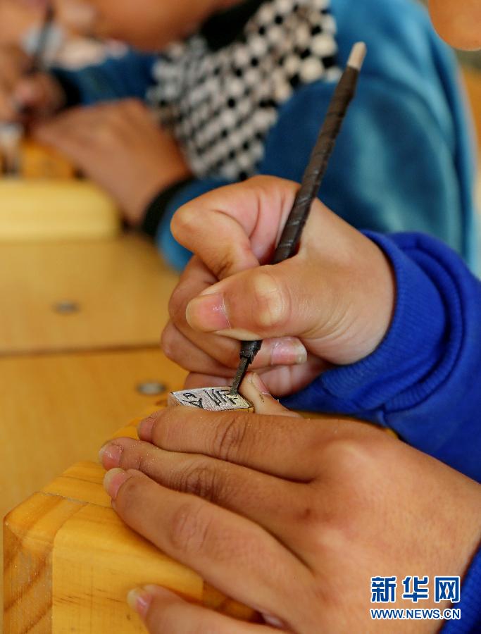 10月14日,昌黎县十里铺乡凤凰山完全小学的孩子们在雕刻印章。(新华网图片 杨世尧 摄)