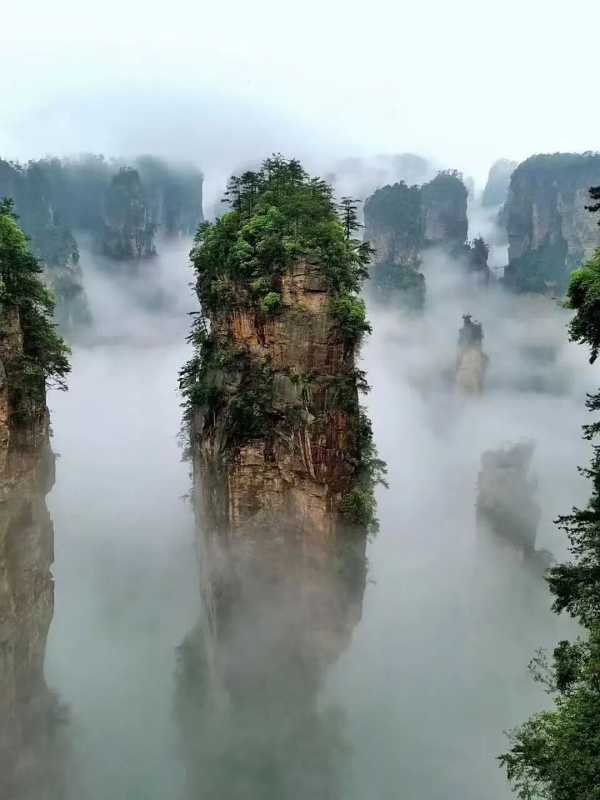 乾坤柱里定的啥乾坤? 站在迷魂台上,放眼百座石峰如巨阵排空,如天兵天将放哨,而我们的目光最终定格在你身上——乾坤柱。你屹立在海拔 1074 米的山涧上,垂直高度约150米,顶部植被郁郁葱葱,峰体因垂直节理切割明显,仿若刀劈斧削,如一把刺破的利剑,又似一位坚守亿万年的巨人,沉默地矗立在云雾缭绕的山谷中。我们不知你伫立了多少个春夏秋冬,看惯了多少遍朝起日落,听懂了多少次风雨呢喃,但你从不言语,始终用挺拔的身姿诉说着什么是坚韧,什么是不朽,什么是默默坚守。这也许是自然“乾坤”的一种体现吧! 当云雾缠绕你的腰间,如丝般的衣裳飘动而舞时,禁不住我们想伸手触摸你那粗糙而冰凉肌肤的心动,你却摆摆手说:这里有危险。相传在很久以前,张家界还是一片汪洋大海,海里有一条黑龙生性凶残,经常兴风作浪残害百姓。于是赤脚大仙从东海龙宫借来定海神针,将黑龙镇压在海底。后来海水退去,定海神针便留了下来成了乾坤柱。听着传说,我们一下子明白了:乾坤柱下镇压着黑龙,它在守护着一方百姓的平安幸福。这也许是保平安的“乾坤”体现吧!