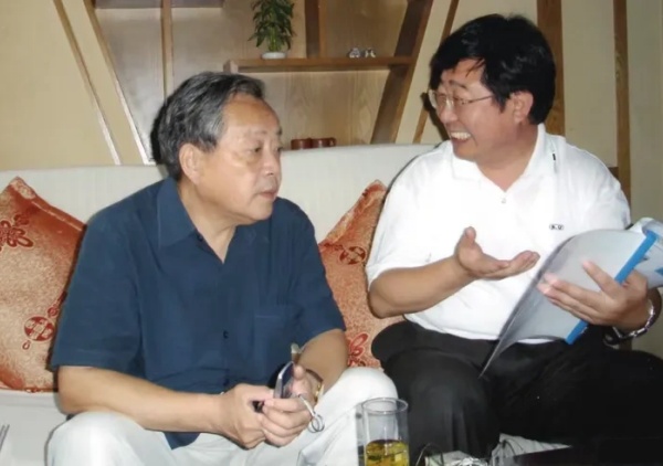 (左:范敬宜与李锦在共同构想“建立中国特色社会主义新闻调查研究理论体系”及现代新闻调查研究“五经”的情形)