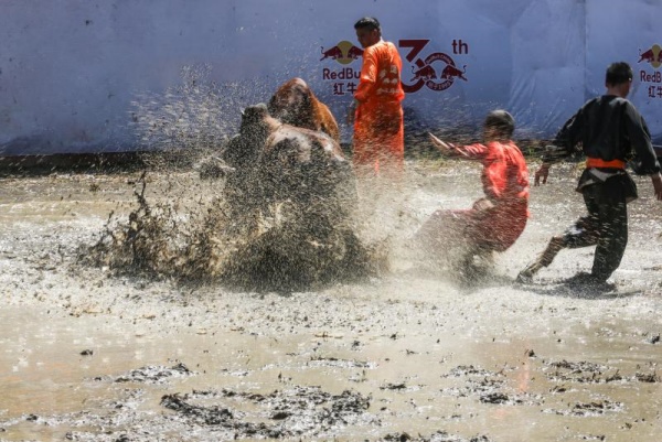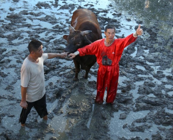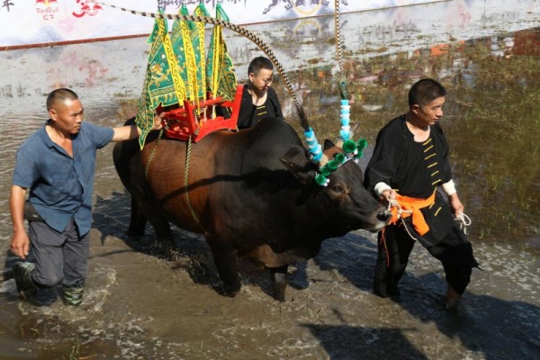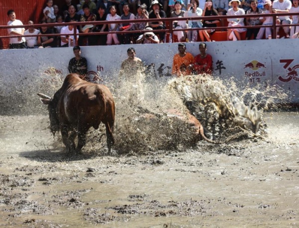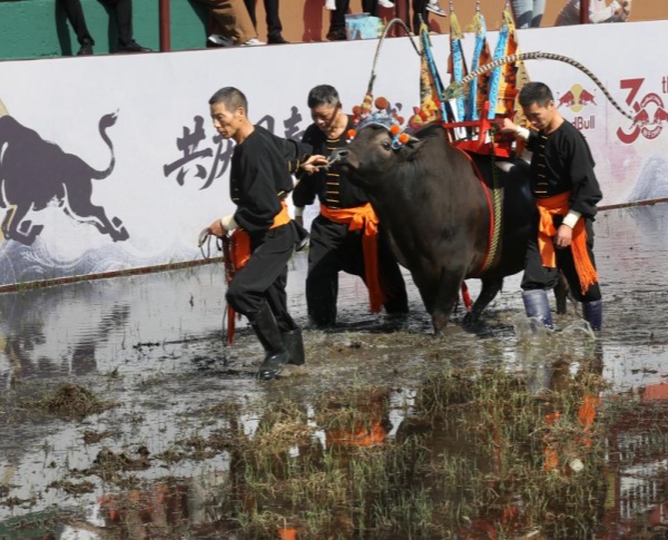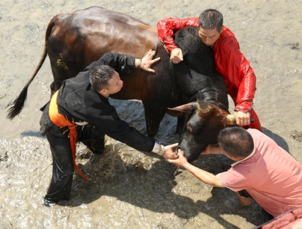赛前,牛主封刀吃素,牛舍贴红联,黄酒调蛋,红糖拌麸,将牛颈养得粗壮如墩,抵御撞击。赛日,迎牛如迎神,试水辨勇怯,“拆手”(方言,指徒手分开斗牛的壮汉)须臾之间便将牛隔开。胜牛披红游村,祠堂摆宴,老人口传胜牛事迹,其名号偶被写进族谱附记,以示荣耀;败牛剃角藏锋,明年再来。斗牛,是牛与牛的较量,也是村与村的荣耀,更是人与土地的和解。