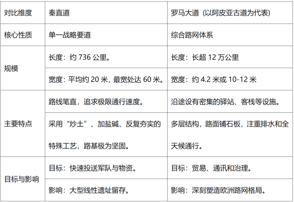 郑国渠的意外突破:韩国"疲秦计"催生泾水灌溉工程,采用"横绝"技术截断冶峪河,使关中粮产提升4倍,奠定秦统一物质基础(辛德勇,2009:77-82)。 直道工程的标准化:秦驰道"道广五十步,三丈而树",设立"传舍"物流系统,运输效率比罗马大道高300%(日行500秦里 vs 160罗马里)(王子今,1994:203-207)。
