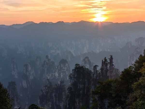 夕阳西下,我们登上了天子山,目睹了那座直指天际的御笔峰:六根石柱并列如笔,顶天立地,峰顶生有松树,形似倒插的毛笔。据传是向王天子兵败殉难后遗落的御笔(天子山也是因元末明初土家族首领向大坤起义而得名)化成石峰,厮守在神堂湾边,而装御笔的“签筒”、“笔架”则留在水绕四门。落日的余晖洒在“笔尖”上,星光点点,更加增添了御笔峰的神秘感。 凝视着御笔峰,我们轻声问道:你这支巨笔静静地躺在这里亿万年,可曾动笔写下雄文韬略?山风掠过峰顶的青松,发出沙沙的声响,这难道是回答我们的一声声长叹吗? “不!”仿佛又听到了一个苍老的声音在耳边回响:我日复一日、年复一年的等在这里,把白云当纸张,把雨水当墨汁,写的并非是具体文字,而是每一个日出染遍峰峦的壮丽、每一场夜雨浸润岩石的深情、每一阵秋风拂过峰海的诗篇,还有那狂风暴雨的写意、云海雾绕的诗文、鸾凤和鸣的对歌......我们一时无语,渐渐清楚:真正的雄文韬略,不在纸上,而在与自然融入一体、读懂山河人的心里! 依依不舍地离开时,御笔峰上的落日在晚霞映衬下,似一条火红的巨龙,莫不是在告诉人们:御笔从今天开始将要谱写祖国大好河山的华章?