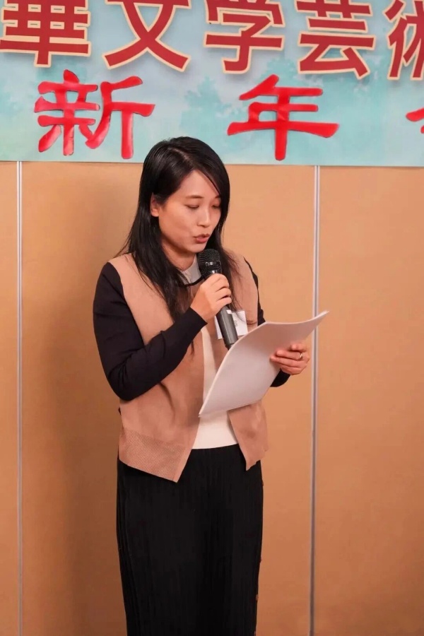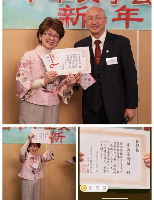 本次新年会活动还包括三个重要环节,一是根据连合会章程,已经连任两届会长的叶卫阳当天正式任期届满,结束第五任会长一职,经艺委会一致推举,自2026年起,傅巍当选为新一届即第六任日本中华文学艺术家连合会会长,原由傅巍担任的事务局长一职由宋茜担任;二是宣布成立日本中华文学艺术促进后援会,刚刚当选的后援会会长田露在致辞中简要介绍了后援会主要工作,包括为中日文化艺术大型活动开展前期宣传、沟通赞助商、艺术家营销和经纪、艺术教育、文化大讲堂等;三是由现任会长叶卫阳正式宣布“2025年协力奖”获得者名单,叶卫阳会长还亲自将“2025年度连合会最活跃最积极的艺术团”大奖颁发给了SONG茜艺术团团长宋茜女士。在会长交接环节,叶卫阳向连合会的各位艺术家表达了最诚挚的谢意,他同时表示:衷心希望各位老师今后能够一如既往地支持新任会长及新一届艺委会的工作。“让我们携手并肩,把连合会这个大家庭办得更好、更有活力,不断发展壮大,薪火相传,发扬光大。”