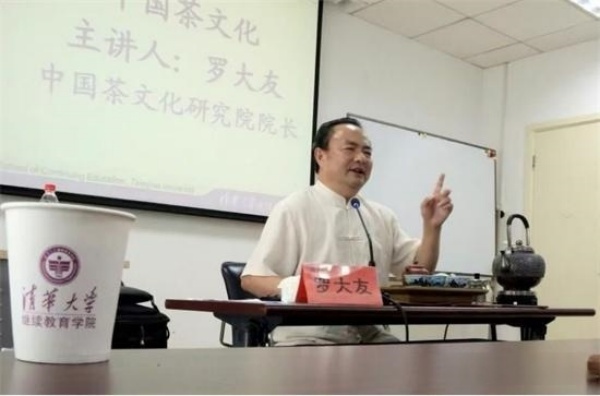 罗大友院长深信,文化真正的生命力在于融入时代、服务人民。他不仅是理论的研究者,更是积极的传播者和推动者。他提出“茶文化进机关、进校园、进企业、进军营、进社区、进家庭、进人心”的“七进”理念,致力于让茶文化走出书斋和雅集,融入现代社会生活的各个场景。 多年来,他的身影活跃在清华大学、北京大学等高等学府的讲坛,为莘莘学子阐释茶文化的深邃;他也深入地方党校、社区文化中心、大型企业,与干部、市民、员工分享科学饮茶与茶文化精髓;他还应国务院侨务办公室等单位之邀,为海外华侨领袖培训班授课,让茶文化成为连接游子与故乡的文化纽带。他的讲座,从不空谈玄理,而是紧扣“健康”与“生活”,用通俗生动的语言,解析茶叶中的健康密码和文化内涵,使听众在袅袅茶香中,感受到传统文化可亲、可用的现代价值。 他积极利用各类媒体平台,包括接受中央电视台、人民网等权威媒体专访,通过报刊专栏、电视节目、新媒体视频等多种形式,持续发声,普及茶知识,倡导“多喝茶少喝酒”的健康生活理念,呼吁社会关注茶文化传承。他的一些充满智慧与哲思的表述,如“饮茶是在与天地通灵、与古人对话”、“茶和天下”、“天下茶人是一家”等,早已深入人心,成为传播茶文化的有力口号。