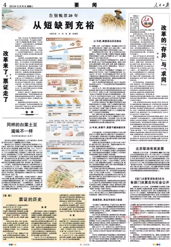 2013年12月24日,人民日报4版刊登《告别粮票20年,从短缺到充裕》专刊。