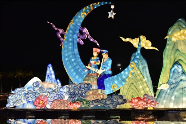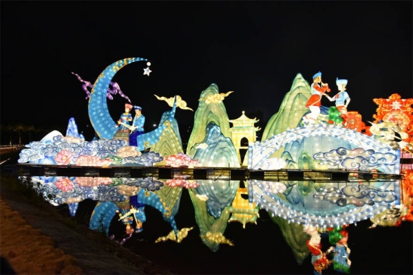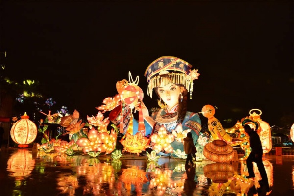 光影交织间,照亮了邕城烟火夜色。本次嘉年华核心的花灯展,由四川自贡花灯非遗团队匠心打磨,共推出“天马降福”“邕城春禧”“壮乡儿女”等近40组造型鲜活、寓意吉祥的主题灯组。9.5万平方米园区内光影流转,山顶30米巨型灯组气势恢宏,与湖面灯影交相辉映,一步一景,营造出如梦如幻又喜庆祥和的视觉体验。