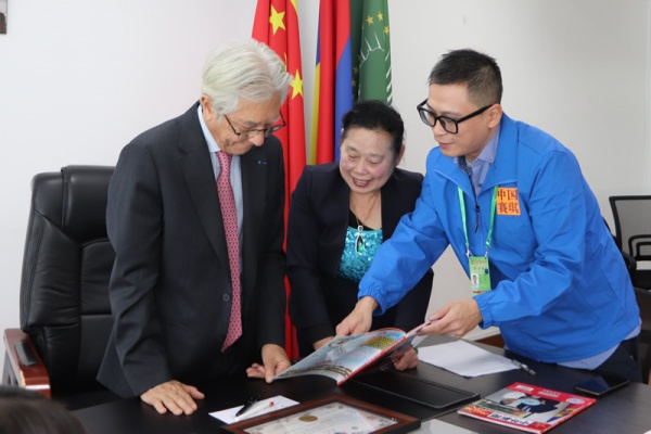 中外新闻社副总裁张珈闻向毛里求斯驻华大使萧晓山阁下(H.E.Mr.Gaetan Michel Siew Hew Sam)推介中外新闻社大使俱乐部