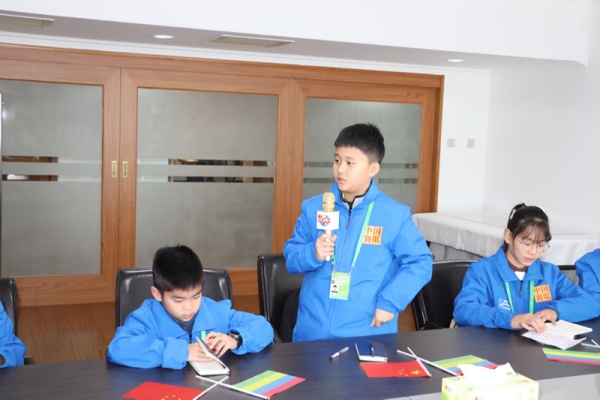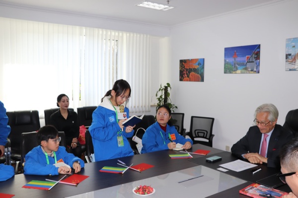 聆听完大使介绍,小记者们一一用流利的英语向大使介绍自己:我叫什么?来自哪个城市、哪所学校读书?我喜欢什么?我的特长?每一个小记者表示,希望在成为两国青少年交流的友好使者。 After listening to the ambassador's introduction, the junior journalists took turns introducing themselves to the ambassador in fluent English: What is my name? Which city and school do I come from? What do I like? What are my special skills? Each junior journalist also expressed their hope to become friendship messengers for youth exchanges between the two countries.