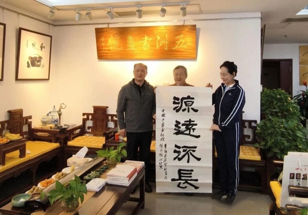 接下来中华世纪坛艺术基金会秘书长赵长岭先生以细腻遒劲的笔触书写了“源远流长”四个大字,寓意两岸文化交流的历史传承。